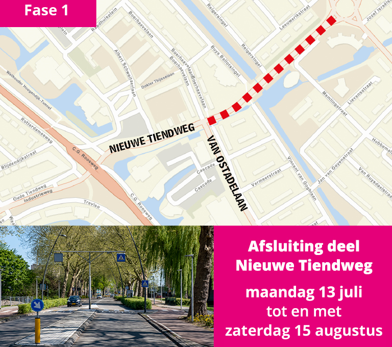 Van 10 tot en met 15 augustus vinden er ingrijpende werkzaamheden plaats op de Nieuwe Tiendweg op het gedeelte vanaf de C.G. Roosweg tot aan de Boerhaavelaan. De bestaande weg wordt verbreed, het huidige wegdek wordt compleet vernieuwd en de aannemer maakt de aansluiting op de nieuwe wisselstrook/fly-over. In fase 2 zijn ook de werkzaamheden vanaf de Van Ostadelaan tot aan de fietsoversteek Buys Ballotsingel nog niet afgerond. Daarom is de weg tussen de C.G. Roosweg tot aan de fietsoversteek ter hoogte van de Buys Ballotsingel in beide richtingen volledig afgesloten voor al het verkeer. Het is alleen mogelijk om onder begeleiding van verkeersregelaars over te steken van de Boerhaavelaan naar de Van Ostadelaan.